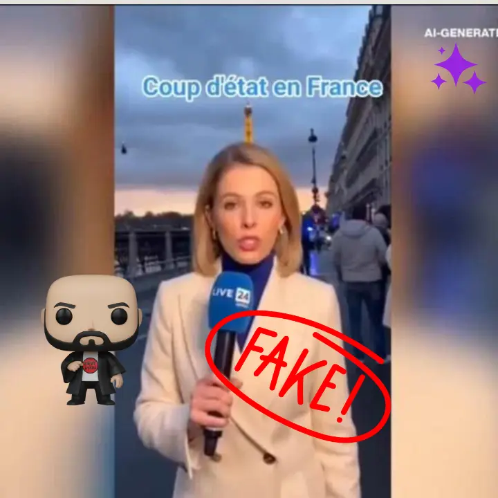 Entre le 9 et le 10 décembre 2025, une vidéo virale a circulé massivement sur Facebook, prétendant montrer l'annonce d'un coup d'État en France. Cette vidéo, entièrement générée par intelligence artificielle, a atteint plus de 13 millions de vues en quelques jours, avant d'être progressivement supprimée par son auteur. La vidéo mettait en scène une fausse journaliste devant l'Élysée, tenant un micro estampillé d'une chaîne d'information fictive appelée "Live 24" (imitant les codes visuels de France 24 ou autre chaine d'info).
